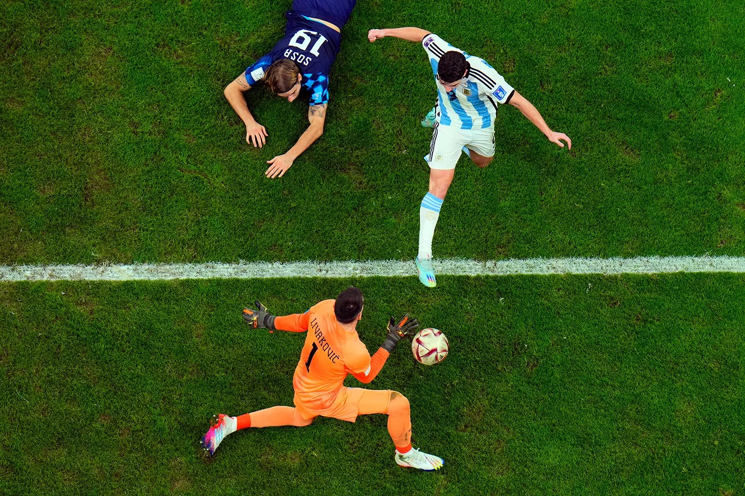 Argentina's Julian Alvarez scores his side's second goal passing Croatia's goalkeeper Dominik Livakovic during the World Cup semifinal soccer match between Argentina and Croatia at the Lusail Stadium in Lusail, Qatar, Tuesday, Dec. 13, 2022. (AP Photo/Hassan Ammar)