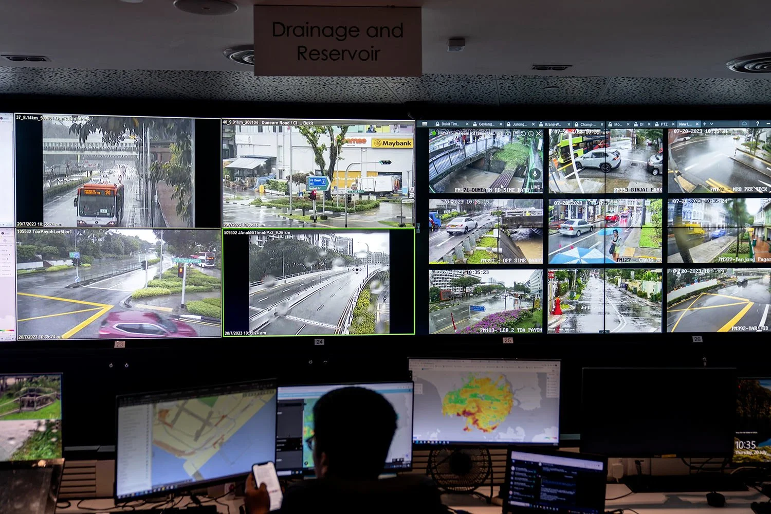 A crack of thunder booms as dozens of screens in a locked office flash between live video of cars splashing through wet roads, drains sapping the streets dry, and reservoirs collecting the precious rainwater across the tropical island of Singapore. A team of government employees intently monitors the water, which will be collected and purified for use by the country's six million residents.