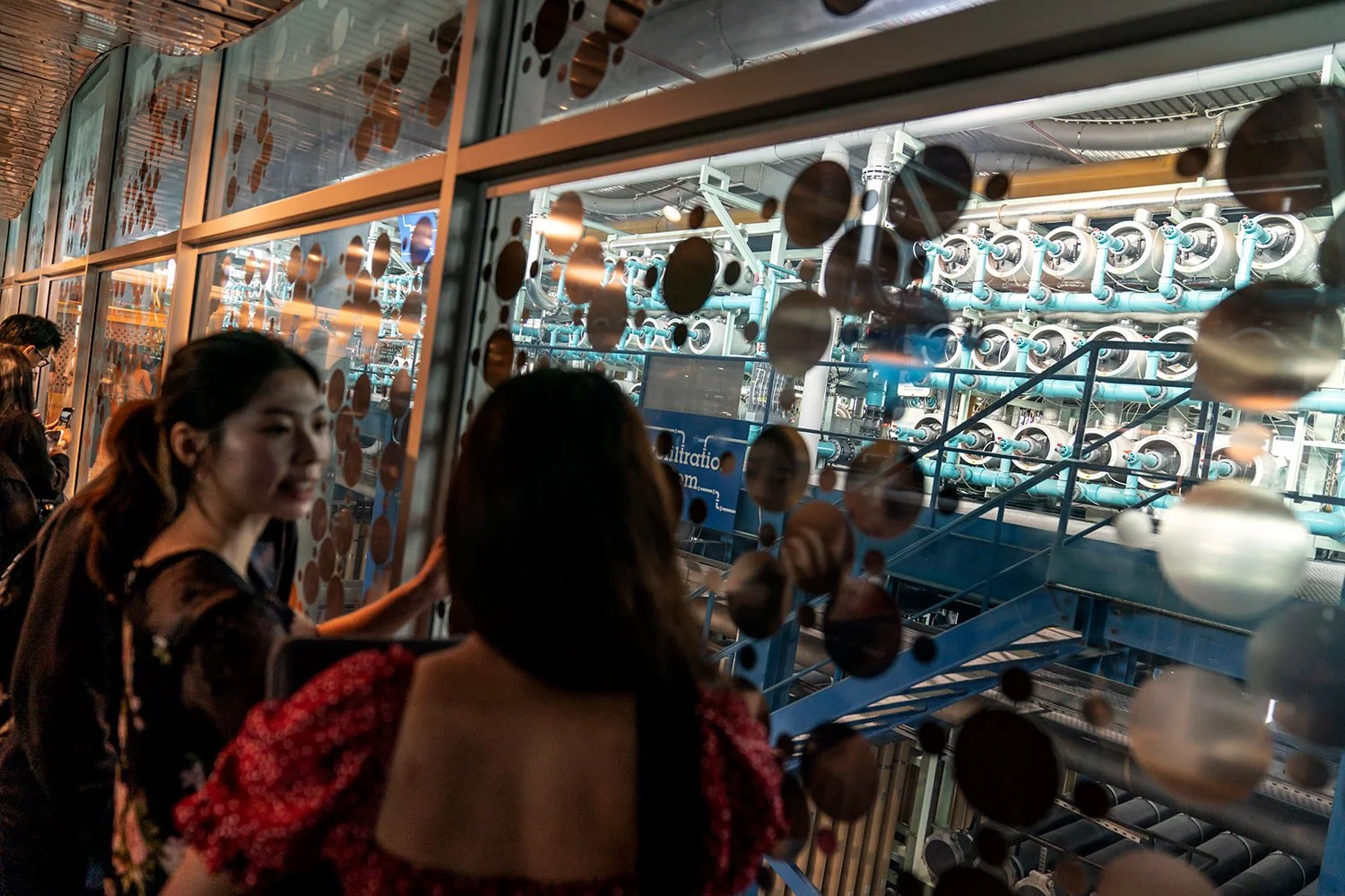 A worker passes under the reverse osmosis membranes on display at the NEWater visitor Center in Singapore, Tuesday, July 18, 2023. During this process, water passes through semi-permeable membranes to separate out bacteria and other undesirable contaminants. (AP Photo/David Goldman)