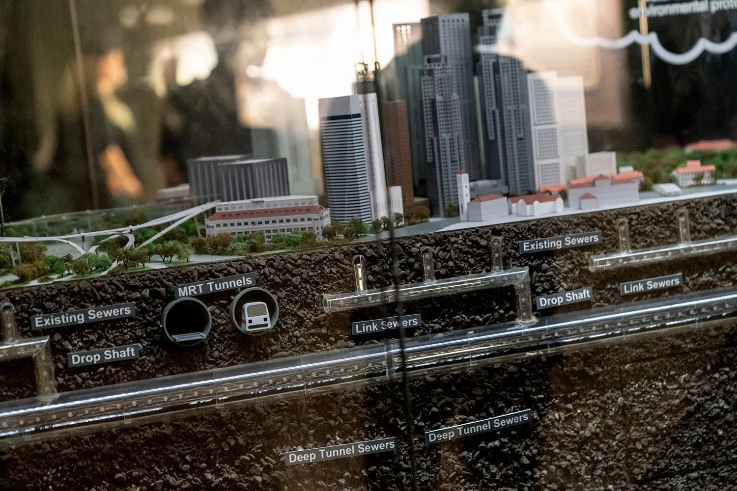 A model shows the underground deep tunnel sewer system as a youth group tours the NEWater visitor center in Singapore, Tuesday, July 18, 2023.(AP Photo/David Goldman)
