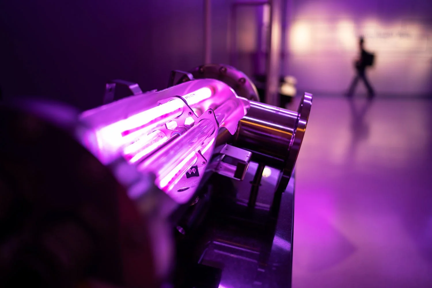 A display shows the ultraviolet light technology used to treat wastewater as a group tours the NEWater visitor center in Singapore, Tuesday, July 18, 2023. At the NEWater processing facility, visitors can walk through mock tunnels, see the inside of filters and answer quizzes on ways they can better reduce their own water use while being able to watch water quality checks in real-time. (AP Photo/David Goldman)