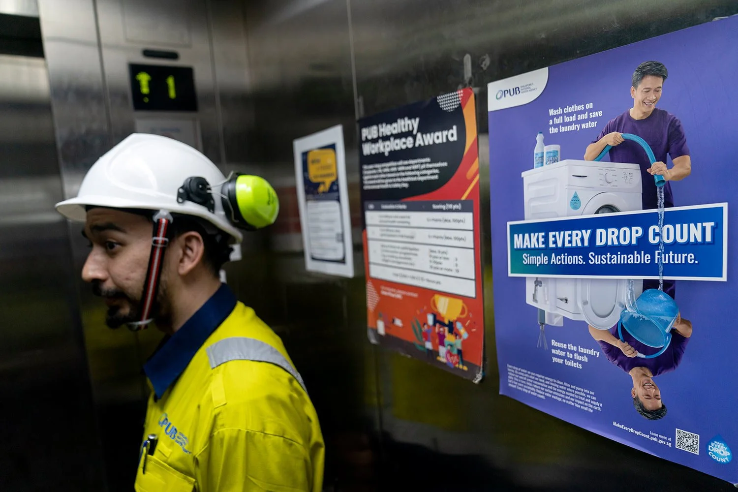 A poster promoting water conservation is posted in an elevator at the Changi Water Reclamation Plant in Singapore, Thursday, July 20, 2023. (AP Photo/David Goldman)