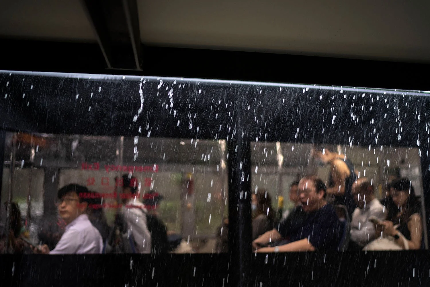 Rain falls as passengers sit in a bus during the morning commute in Singapore, Thursday, July 20, 2023. (AP Photo/David Goldman)