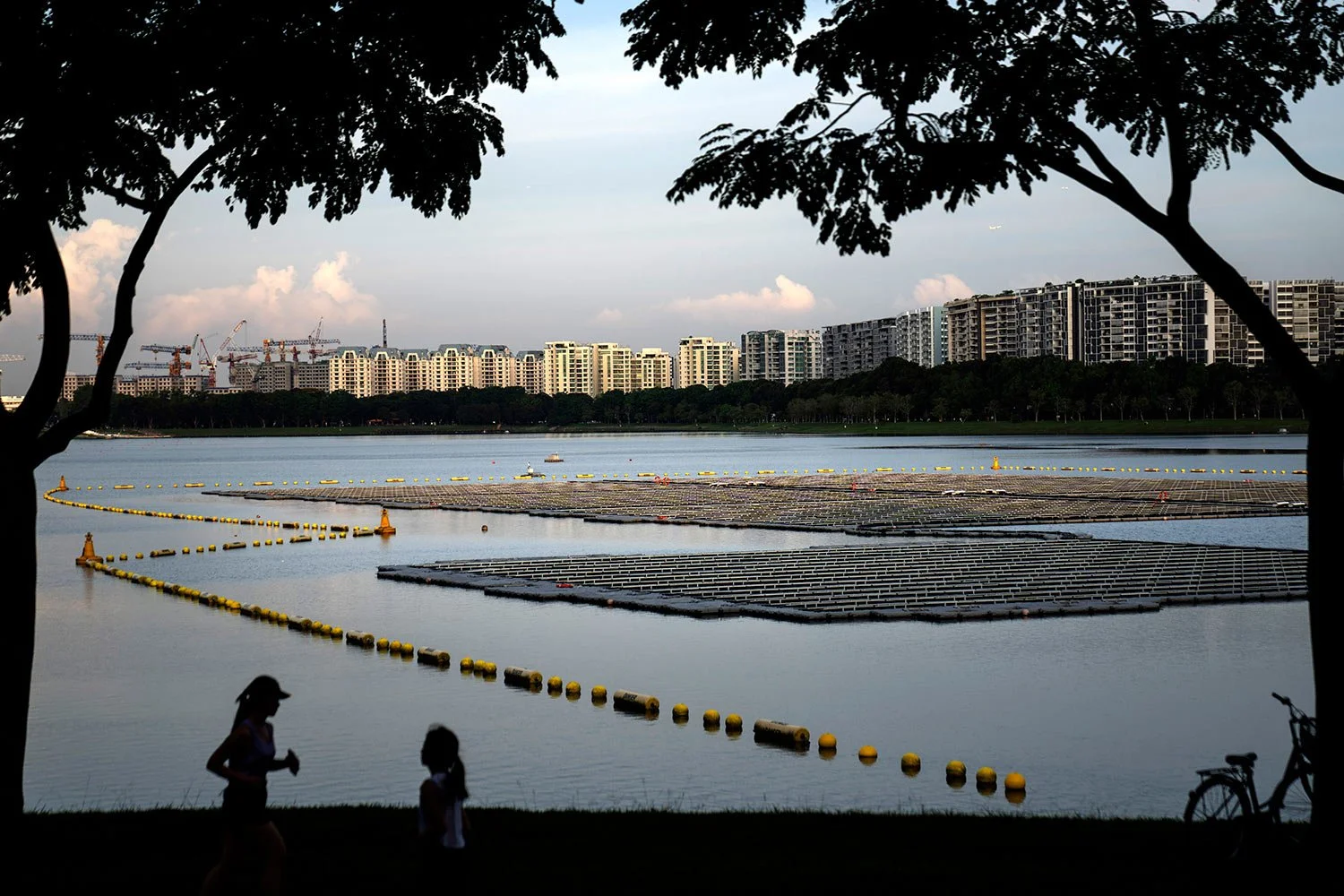 Joggers pass by a floating solar panel farm on the Bedok Reservoir lined by apartment buildings in Singapore, Sunday, July 16, 2023. (AP Photo/David Goldman)