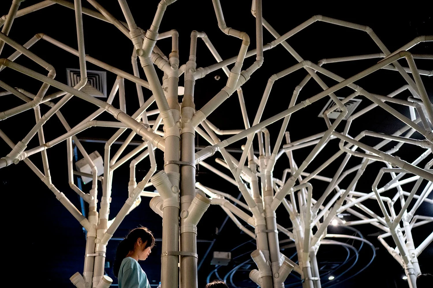 A child passes under a water piping exhibit at the NEWater visitor center in Singapore, Tuesday, July 18, 2023. (AP Photo/David Goldman)