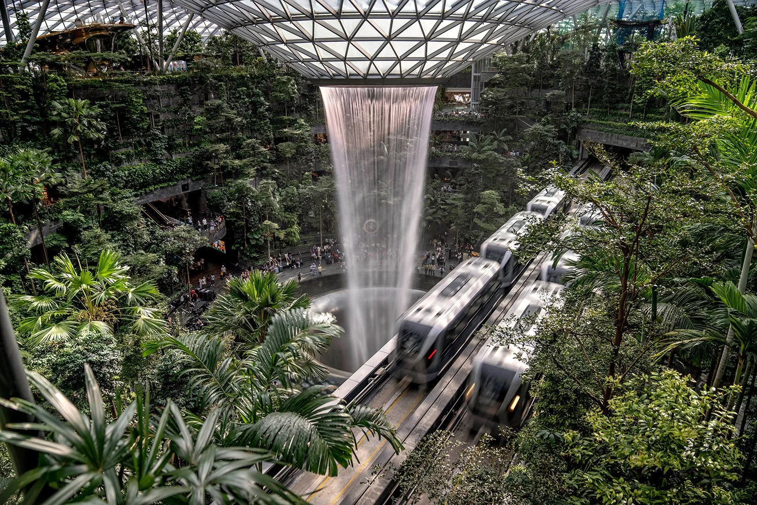 A Skytrain shuttles passengers between terminals through the Jewel complex at Changi Airport, Sunday, July 16, 2023, in Singapore. The nature-themed complex boasts the world's tallest indoor waterfall surrounded by a five story indoor garden with thousands of trees, plants, ferns and shrubs. (AP Photo/David Goldman)