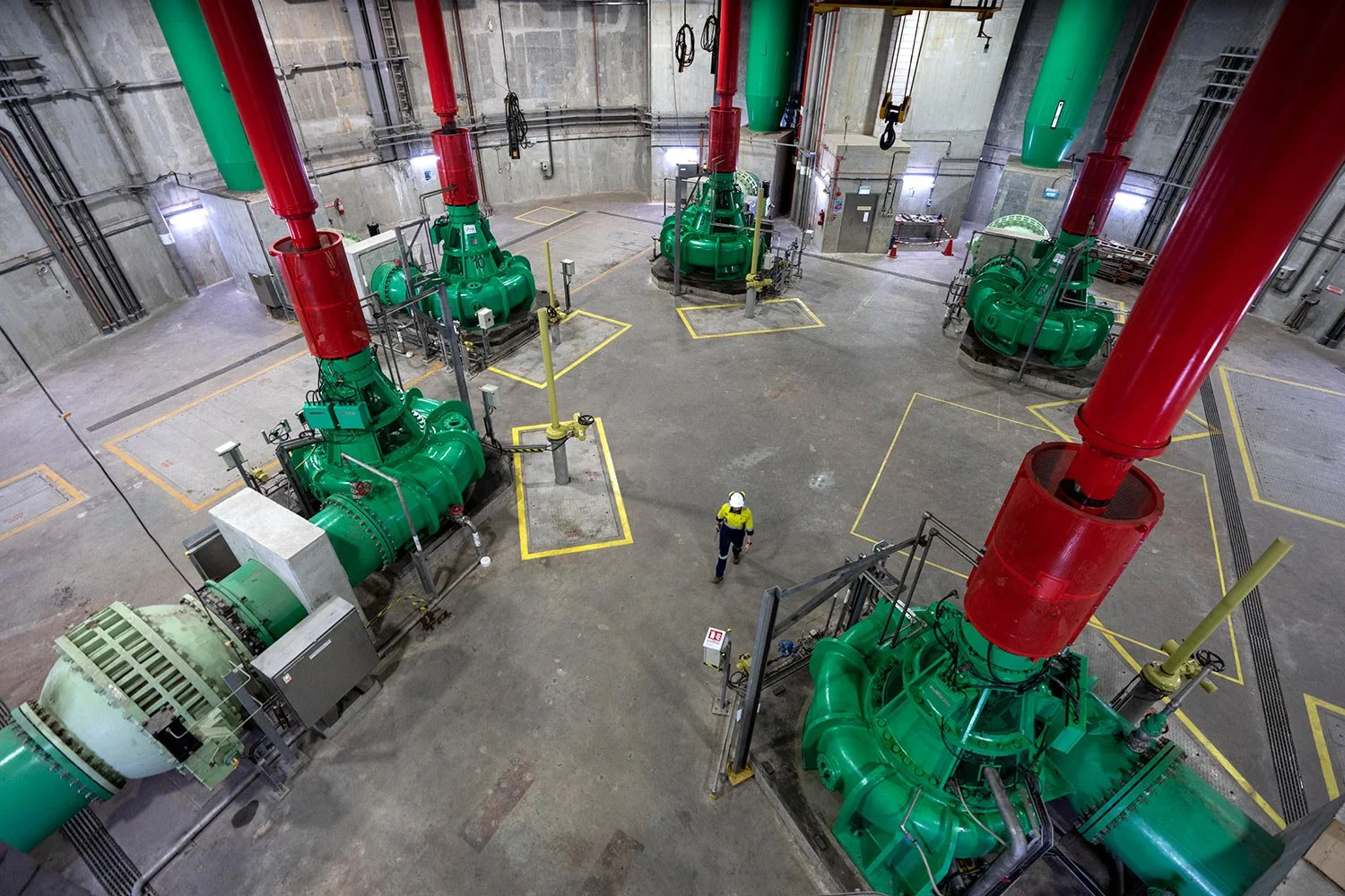A worker walks through a pumping station at the Changi Water Reclamation Plant in Singapore, Thursday, July 20, 2023. The 50 meter- (164 foot-) deep pumping station receives used water from a sewage tunnel before its treated at the plant into purified NEWater, Singapore's own brand of reclaimed water. (AP Photo/David Goldman)