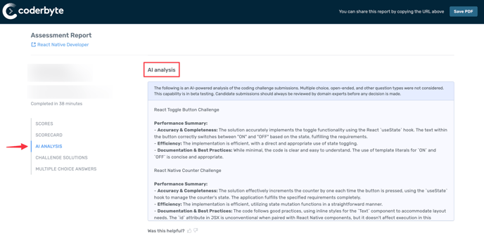 If you have opted in and enabled the Project grading & report analysis AI feature, you will see an automatically generated summary of the candidate's coding challenge submissions and any take-home project challenge grading if they're selected on an assessment.