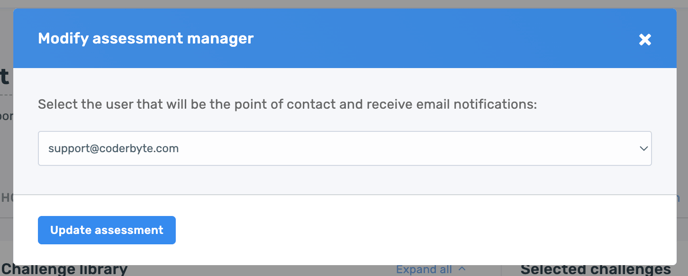 When an assessment is created, account admin with the permission role of Owner or Manager will be able to select the admin that receives email notifications when a candidate submits the assessment. This admin will be the manager of the assessment.
