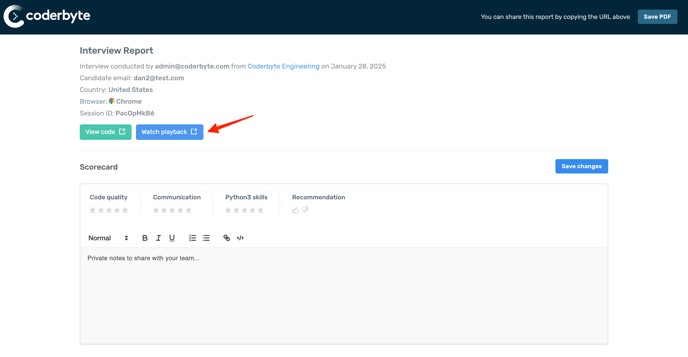 At the top of the candidate's report, you will see a link to View code and Watch playback.
