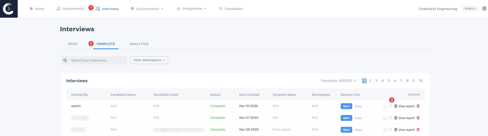 To replay the candidate's code from a code interview, first navigate to Interviews, then Complete, then click View report next to the relevant interview.