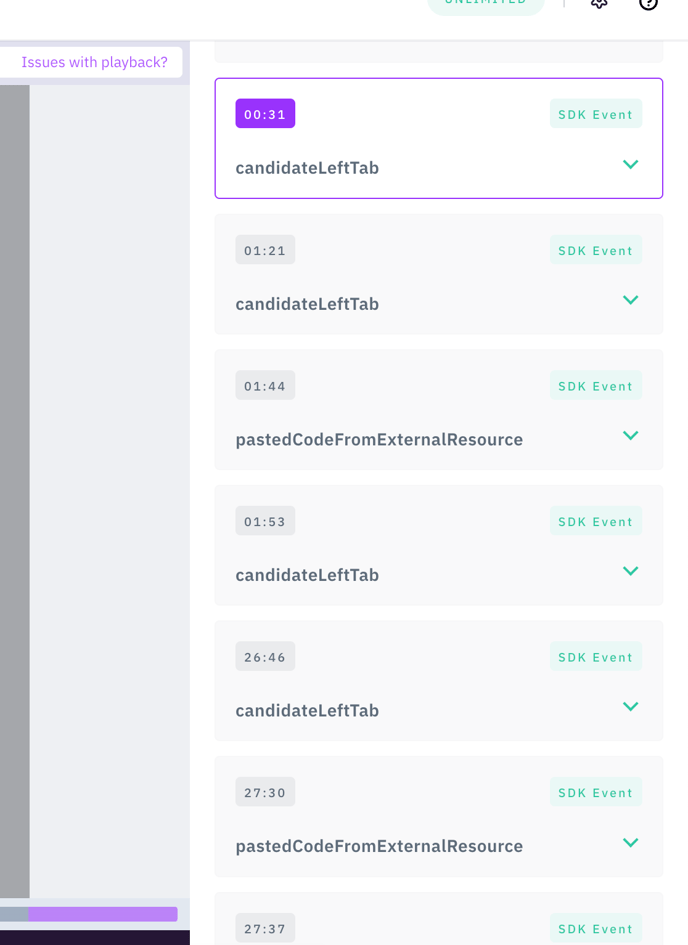 To reopen the interview, click View code. To open a video replay of the interview, click Watch playback. In the events tab of the playback page, you'll also be able to see any cheating events we captured, such as leaving the tab and copy and paste. See screenshot below for an example.
