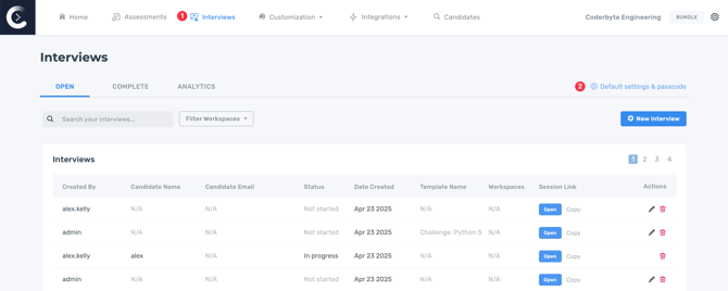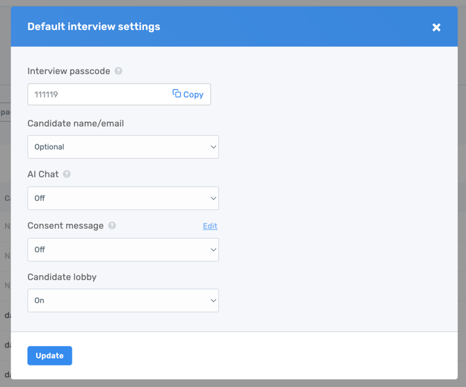 Once the modal appears, you will be able to copy the account passcode for interviewers and select your default settings, including: