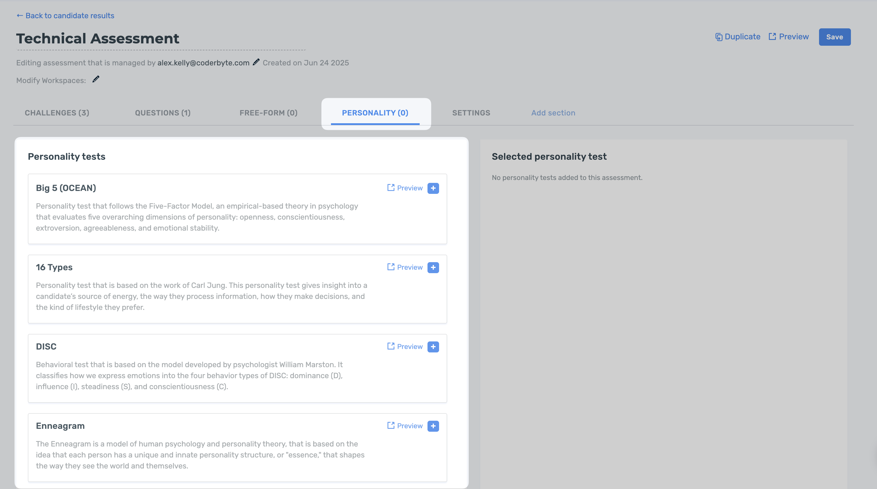 To utilize personality testing within an assessment, first make sure you have the add-on enabled. Then, from within any assessment, click Edit and navigate to the section Personality.