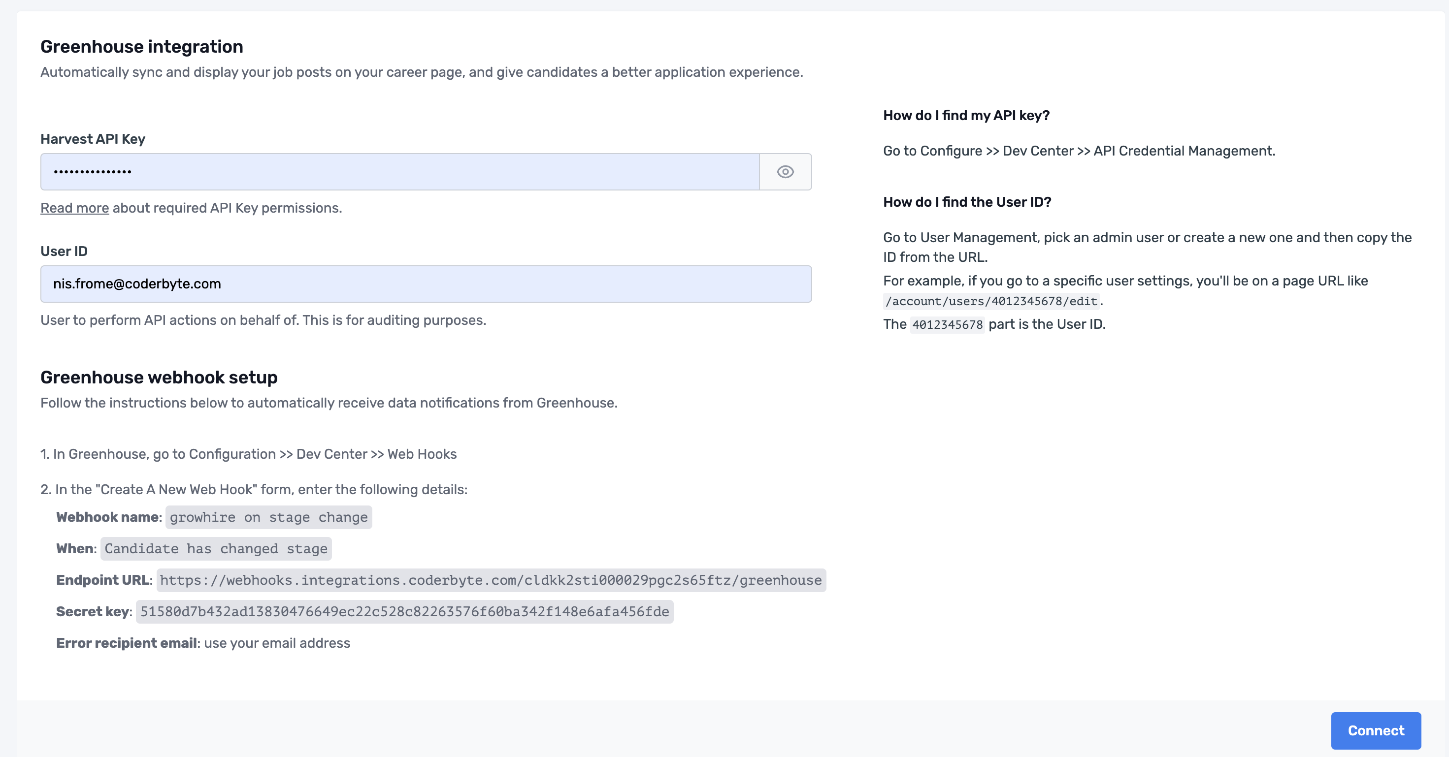 Step 7: Click Connect. Coderbyte is now receiving instant notifications about stage changes in Greenhouse.