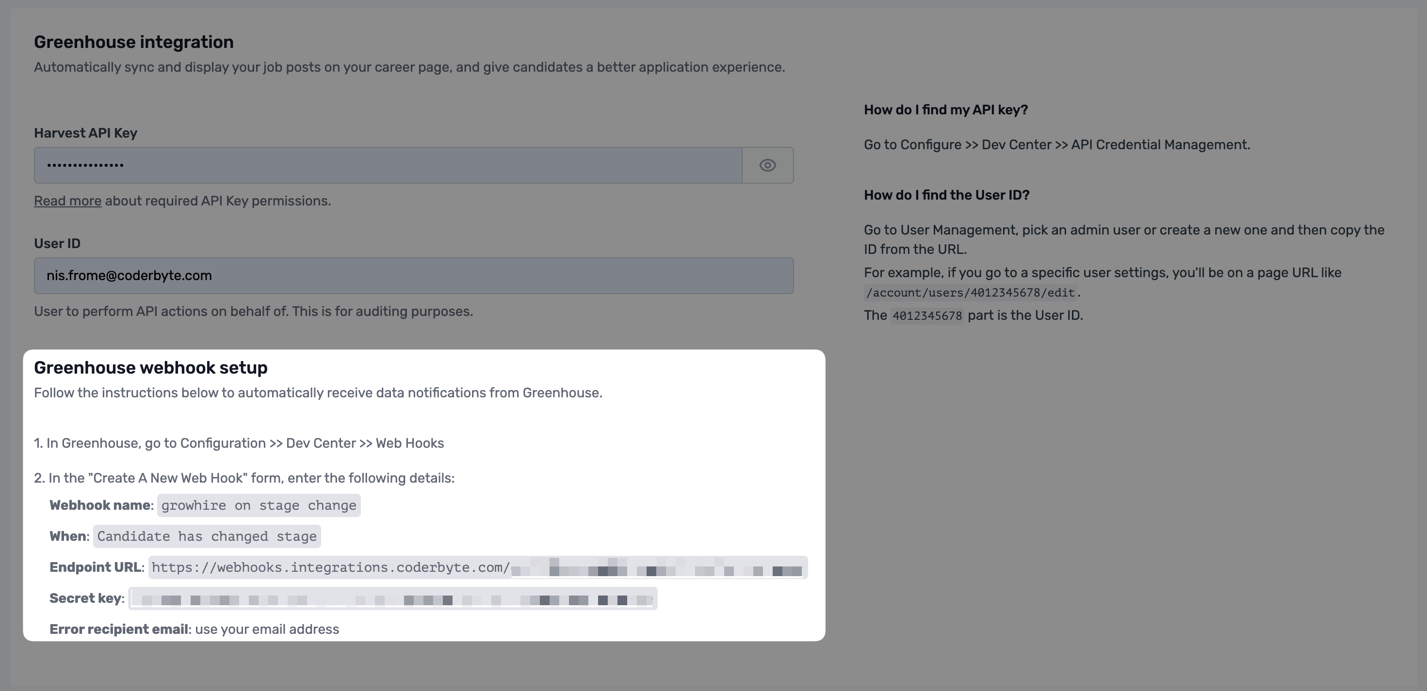 Step 6: In order to receive notifications from Greenhouse, we need a webhook to be set up between Greenhouse and Coderbyte. Read more about webhooks in Greenhouse here.