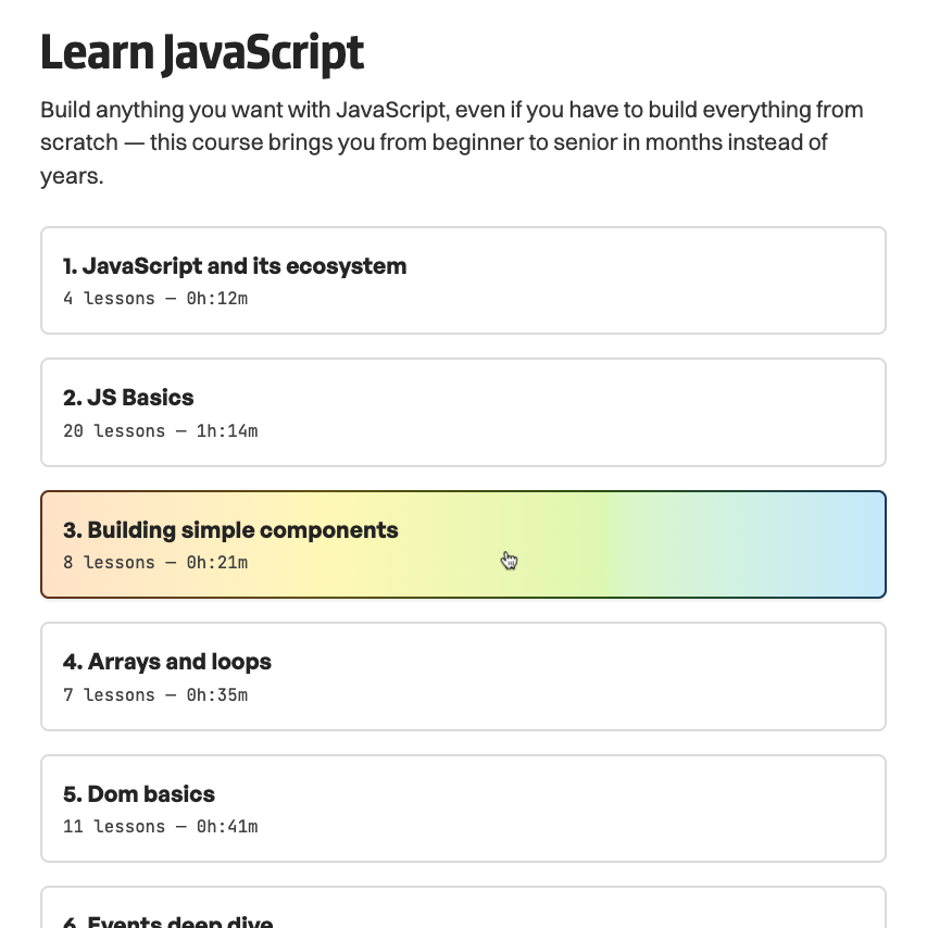 If you’re looking to learn JavaScript, Zell just made a new course that shows how to build 20 real components from scratch, step by step.