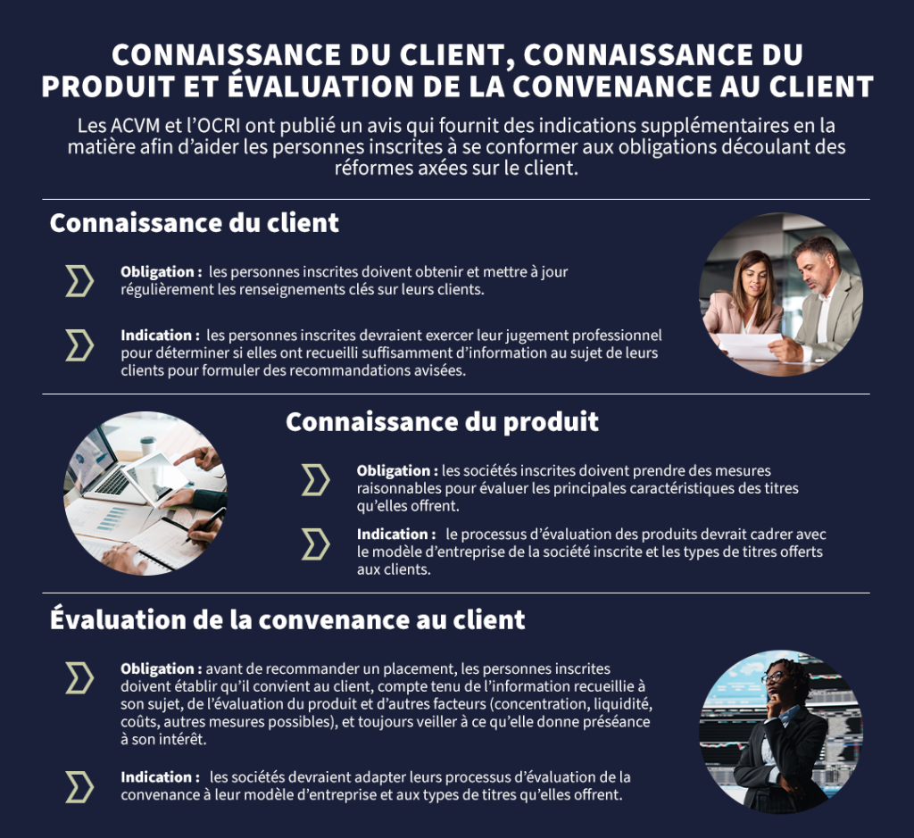 Les ACVM et l’OCRI ont publié un avis qui fournit des indications supplémentaires en la matière afin d’aider les personnes inscrites à se conformer aux obligations découlant des réformes axées sur le client.